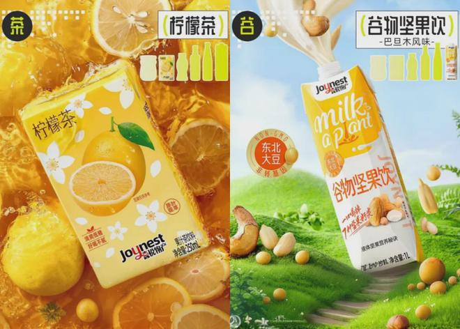 据官方介绍,柠檬茶饮料添加有真实柠檬汁和乌龙茶原叶萃取汁,果汁含量≥5%,糖含量为4.3g/100ml;另一款是谷物坚果饮,内含杏仁、腰果、大豆、巴旦木、葵花籽、芝麻和花生,每盒中坚果及籽类含量为45g,糖含量≤5g/100ml,并添加有益生菌(动物双歧杆菌乳亚种),添加量≥3×10^7CFU/L。